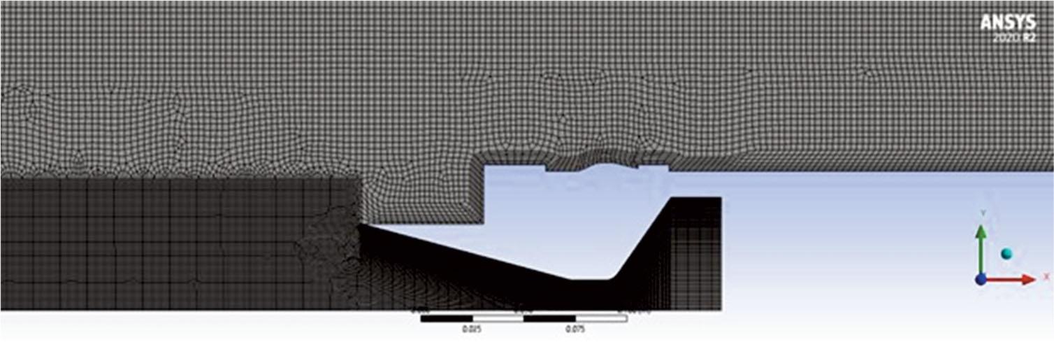 Secondly, performing external aerodynamic CFD simulations requires the modelling of the boundary layer during meshing; this is done in the form of inflation layers. For this to be done correctly, one must estimate the boundary layer thickness formed in the range of the Reynold numbers experienced during the flight of the vehicle [9] and model the inflation layers to contain the approximated boundary layer thickness. It was decided to keep the 30 ≤ y+ ≤ 300 to implement the wall function approach for the shear stress transport (SST) k-ω turbulent model within Ansys® Fluent, as this provides a shorter calculation time and lower number of mesh elements compared to y+ ≤ 1, while keeping the results relatively accurate. A similar choice of y+ has been observed in a previous paper [10]. For the nozzle, a bias factor was applied for capturing the boundary layer, followed with a dense mesh in the plume region. The mesh for the aforementioned domain regions was divided in the same manner (Figs 9 and 10).