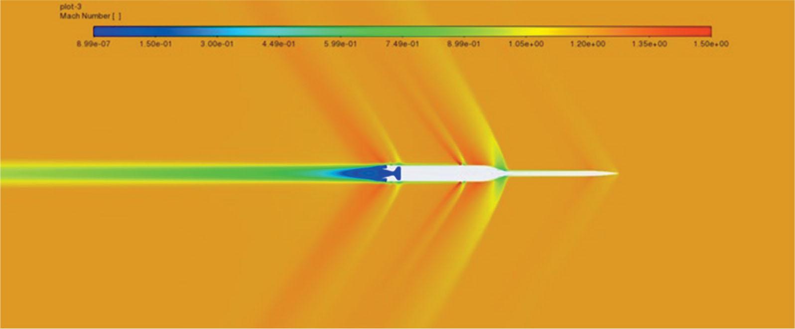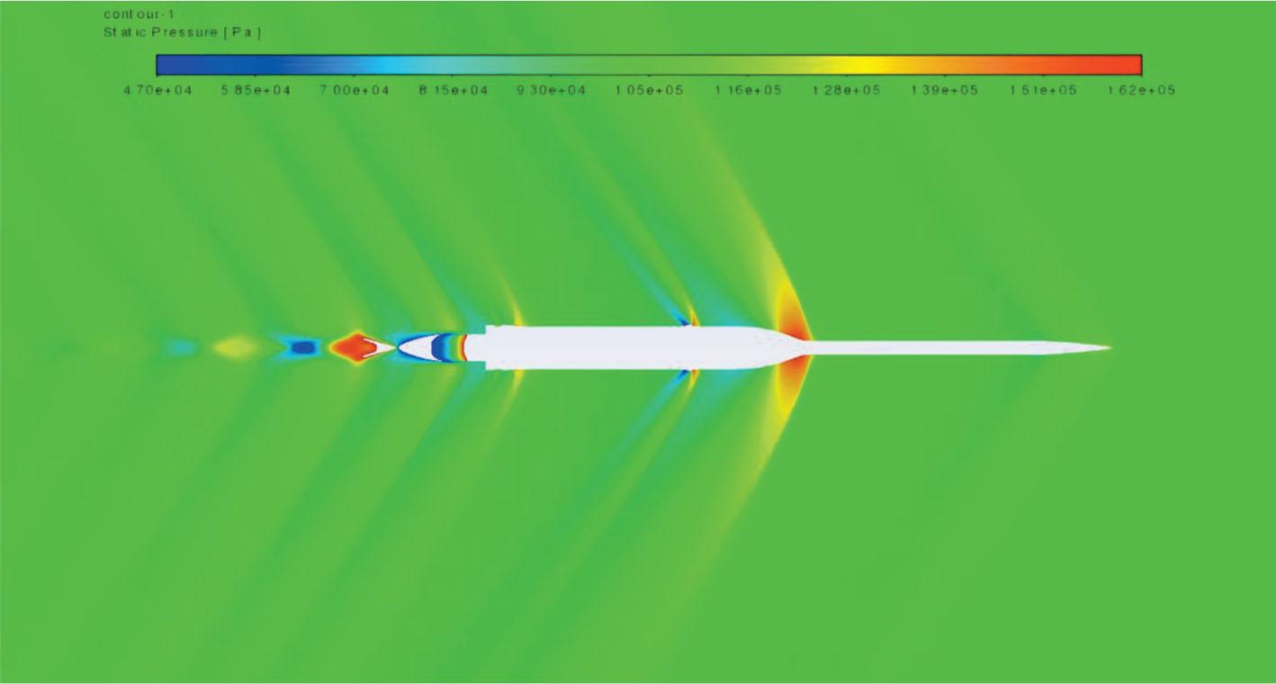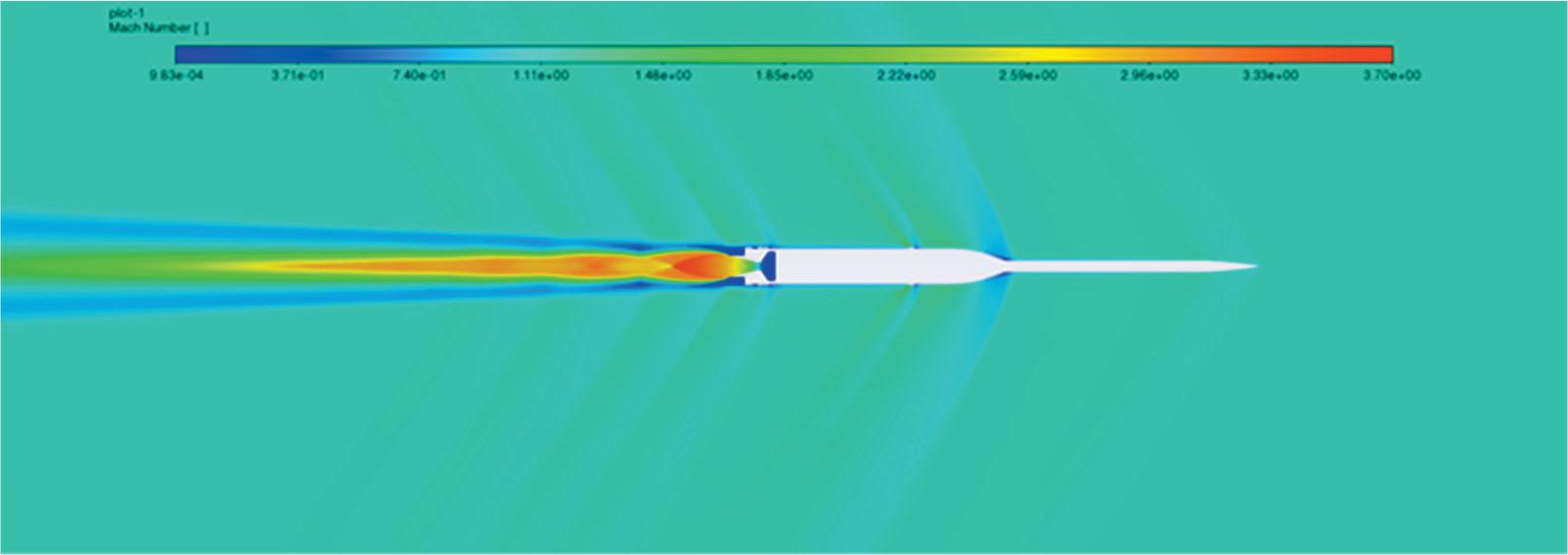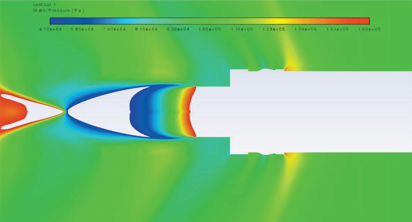 For qualitative analysis of the obtained flow fields, the Mach number and static pressure, the contour plots for the operational and non-operational propulsion systems were analysed for the Mach number 1.2. The shock waves developed on the rocket appeared dimmer in the Mach number contour plot for the active motor than for the inactive motor (see Figs 11 and 12). This was due to the exhaust plume travelling at a Mach number three times greater than the free-stream air. Figures 13 and 14 present the static pressure for the same Mach number. Figures 15 and 16 show the closed-up static pressure contour plots for the aforementioned contour plots. It is important to note that the static pressure near the aft end (as defined by the red lines in Fig. 17) is lower in the engine-off case.