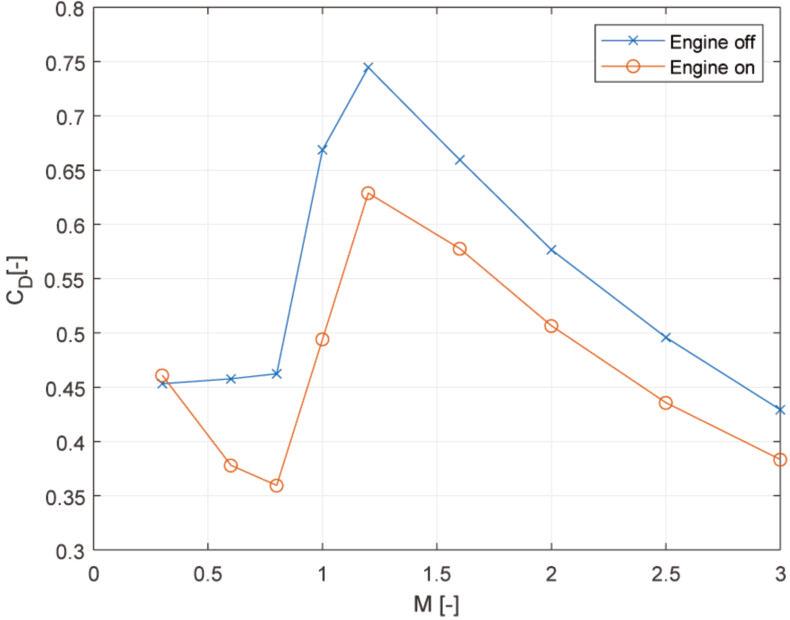 The axial forces present during the flight of the rocket vary depending on the Mach number and operation status of the propulsion system. Therefore, two cases were distinguished, the first being the non-operational propulsion system and the second being the operational propulsion system.