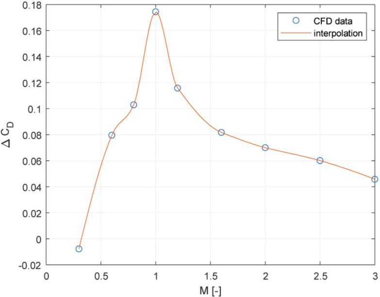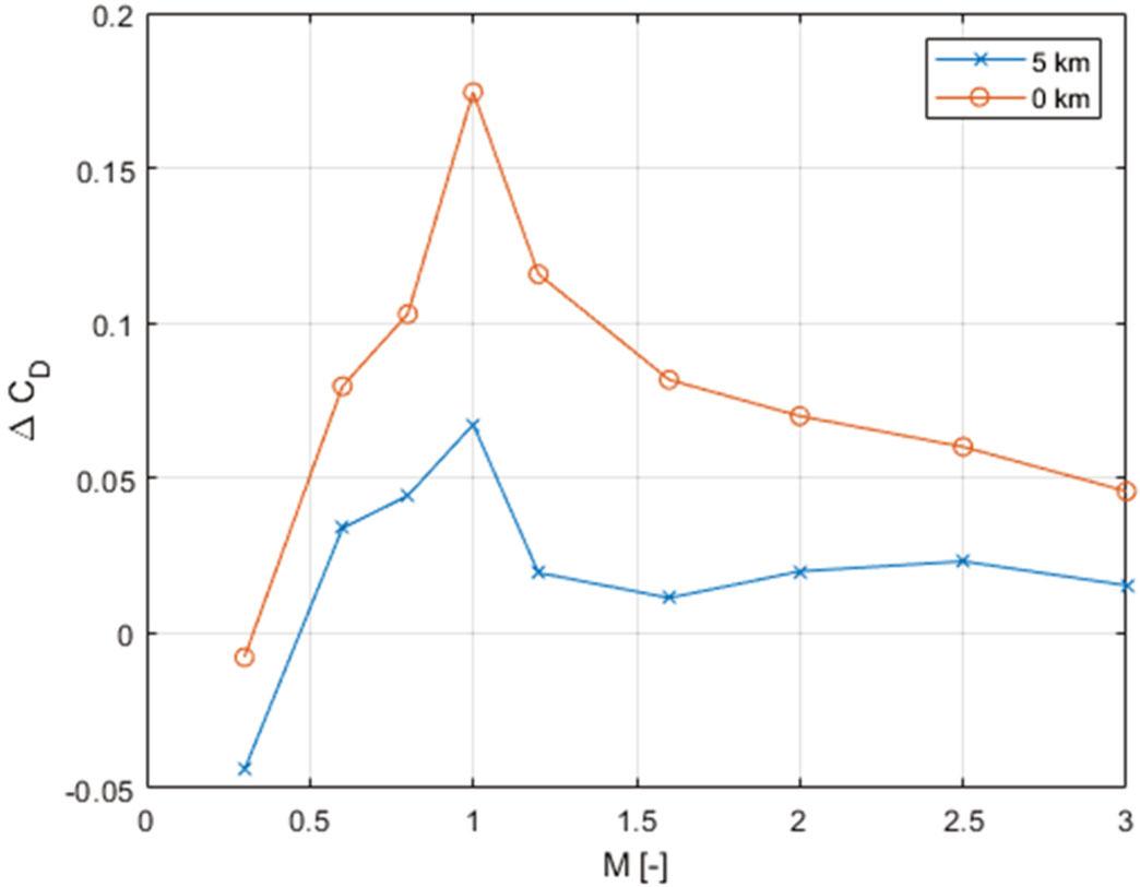 Since the atmospheric parameters change with flight altitude, it is worth considering whether they affect the previously shown results. Additional numerical simulation for the flight altitude of 5 km was performed. For this altitude, the static pressure of 54,050 Pa and static temperature of 255.7 K (−17.45°C) were assumed. Figure 22 presents the comparison of ΔCD between the results for this altitude and sea level. ΔCD decreases with altitude in a proportional manner. The main reason for this difference is that the change in pressure and density influences the compressible behaviour of the flow. In addition, viscous effects are more pronounced due to the decrease of Reynolds number at a given Mach number for the 5 km case. However, upon analysing the CFD results, it became clear that the difference in viscous drag is negligible in comparison to the effects of pressure. Further analysis is required in order to model the dependence of ΔCD on flight altitude.