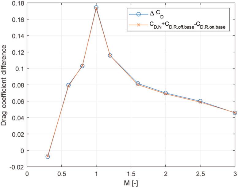 Indeed, the plot of both sides of the approximate equality in Fig. 21 proves that they are indeed almost identical. Consequently, it is confirmed that the influence of propulsion system operation on drag can be fully explained by the pressure acting on the aft end of the rocket.