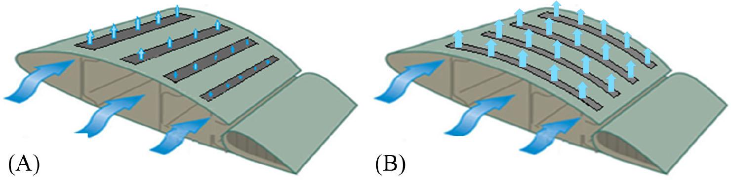 Schematics of microblowing through the array of lateral slots (A) and longitudinally placed slots (B).