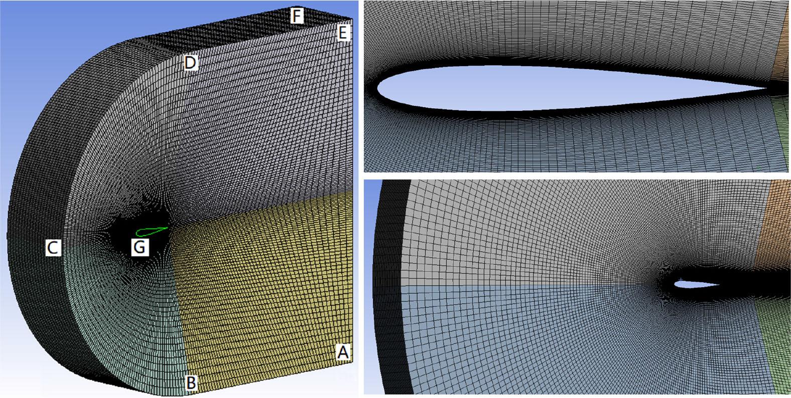 The computational domain ABCDEF (Fig. 3) had a C-topology, and its dimensions were determined as follows: the radius of the arc BCD and the lengths AB and DE are 6- and 8-times more than a chord c, respectively. The width EF corresponds to the span L. Inside the ABCDEF, a structured mesh was built, the detailing of which, when approaching the wing section G, was chosen based on ensuring the condition of the height of the wall cells in the wall law coordinates y1+ ≤ 1, which was achieved with the number of nodes 12.3 × 106 and the use of large bias factors (1,000–1,500). In addition, due to the interest in the wake flow properties and to ensure high resolution when calculating the parameters of viscous flow behind the airfoil, the mesh was refined in the vicinity of the trailing edge and behind it, as well as in the near wake area. The results of mesh verification in the process of preliminary testing showed that a further increase in the number of nodes and a decrease of the size of near-wall cells do not lead to any significant changes in the results of numerical calculations.