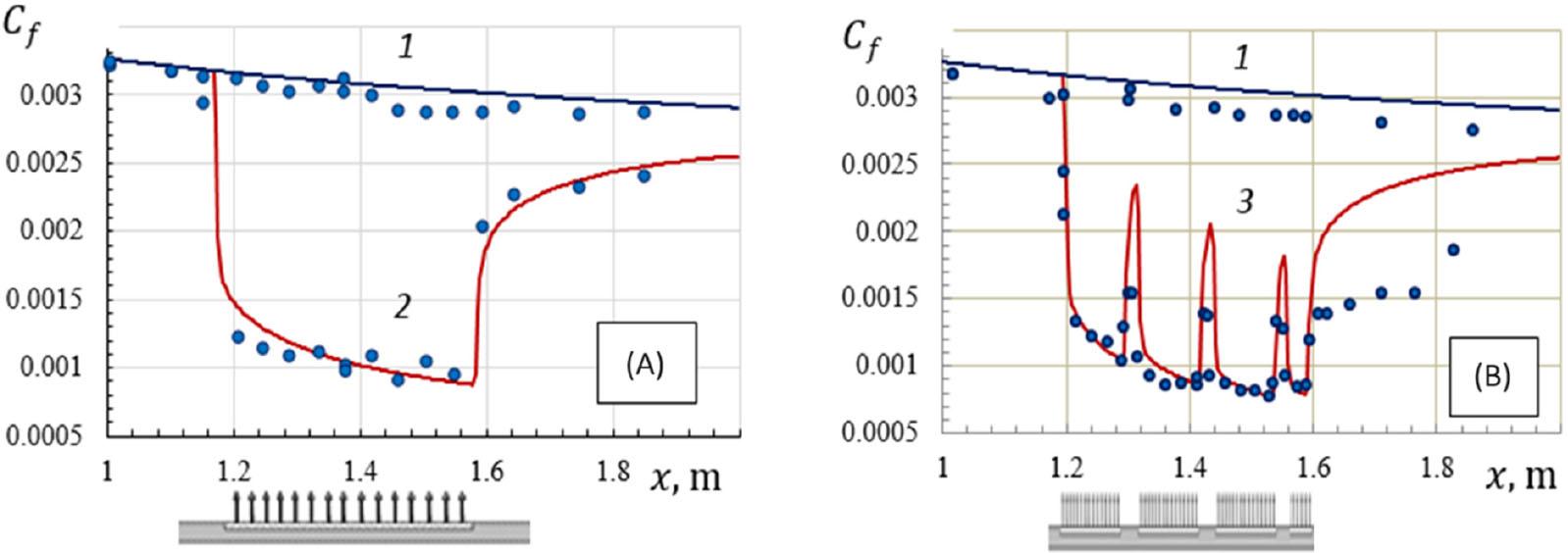 Local skin friction coefficient Cf distribution along the longitudinal coordinate x of flow development around flat plate without (1) and with microblowing (2, 3): circles – Kornilov-Boiko experiments [6]; lines – Shkvar’s numerical predictions. Cases (A) and (B) correspond to the uniform and intermittent microblowing, respectively, with blowing intensity Cb = Vy/V∞ = 0.00277.