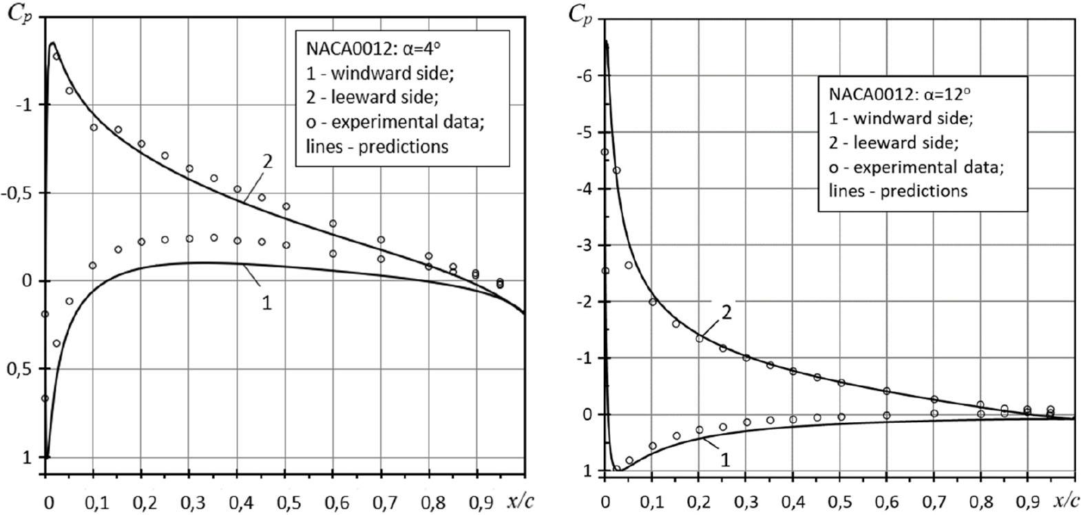 The results of Cp(x/c) modelling in the reference configuration, i.e. without mass-exchange through the streamlined surface, are shown in Fig. 5 for two angles of attack (for α = 4° and α = 12°). The result of Cp(x/c) modelling with suction ( vn = −0.00687 U∞) through one of airfoil sides for α = 0° is illustrated in Fig. 6A, and Cp(x/c) modelling with the same suction intensity through one of wing sides for α = 0° in combination with blowing through the opposite airfoil side (vn = 0.013 U∞) is presented in Fig. 6B.