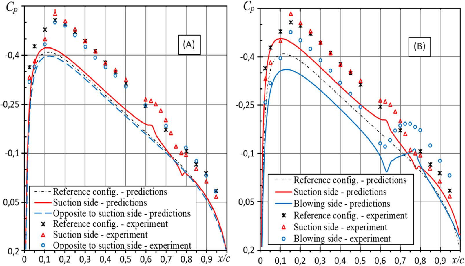 The obtained results demonstrate a quite good level of correlation between the behaviour of numerical predictions of pressure coefficient distribution along chord and the corresponding experimental data both for the reference configuration and in the cases of separate suction and combined suction-blowing.