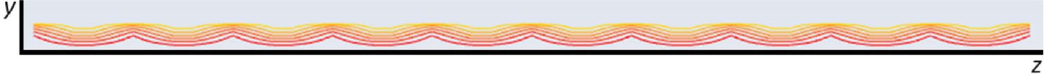 The next step of study of the properties of mass-exchange through the streamlined surface is associated with arrays of longitudinally arranged permeable slots (Fig. 2B). We suppose that the arrays of longitudinal permeable slots allow to intensify turbulent vortical structures exchange in the lateral direction and, as a result, improve flow stability to stall. Moreover, due to creating the regular anisotropy of the boundary layer in the lateral direction, this modified blowing technique can potentially have some synergistic properties, which can give the additional benefits. Here, we shall demonstrate only the first attempts of this idea realisation. The span of wing section was separated into n subsections with permeable slots, occupying a half of the subsection length along the lateral coordinate. The developed UDF allows to change the slot number n, slot location, length along chord and width along span as well as mass-exchange intensity. The obtained results of an uneven, but at the same time regular distribution of the isolines of the longitudinal velocity component in the vicinity of the streamlined surface of a flat plate in the transversal z direction with respect to the incoming flow in the case of 11 longitudinal slots, uniformly installed along its span are illustrated in Fig. 7. In the absence of blowing through these longitudinal slots, the isolines should be strictly parallel to the wall, whereas the presence of blowing naturally leads to local displacement of the flow and its velocity isolines above the slots in the normal to the wall direction y, which is adequately reproduced by the developed numerical model.