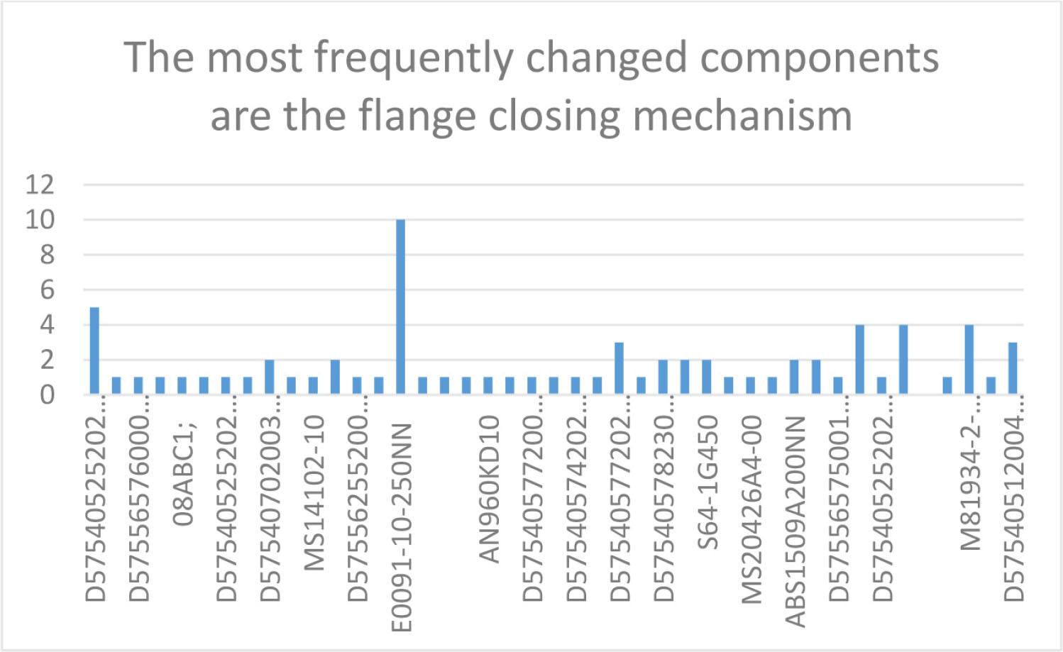 According to the given information, we can say that more often we change PN E0091-10-250NN braid, then PN D5754052520200A cover pitot bolt, PN D5754057420200A cover and PN D5754057720000 seal, which means that these parts of the mechanism are quickly damaged and in case of failure, we can predict that.