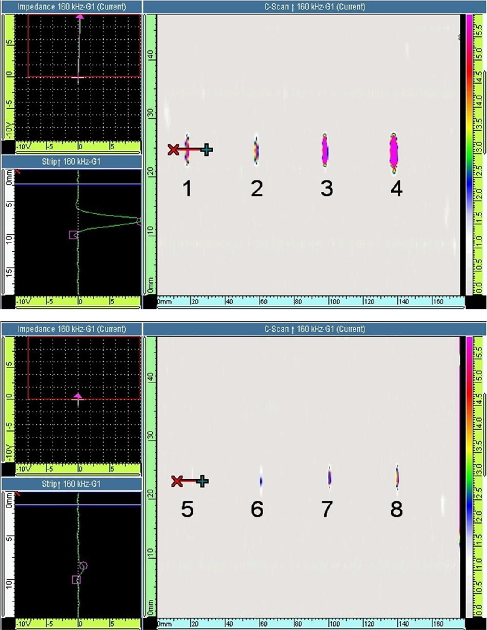 | No. of defect | The number of holes n (length in mm) | Signal amplitude from the defect (V) | ||
