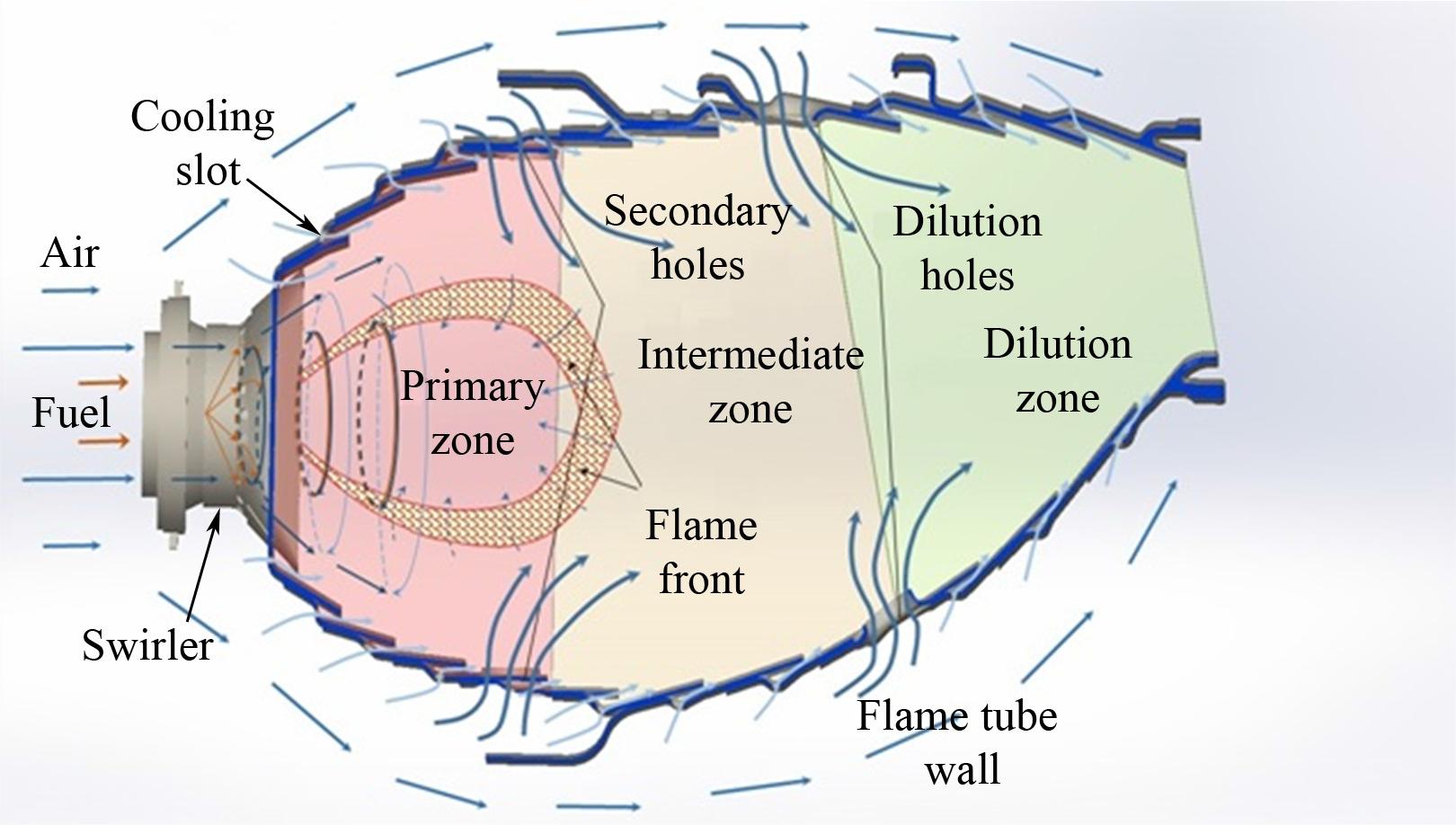 The flame tube is one of the most complex and critically important parts of the turbofan engine, upon which the engine’s main characteristics, reliability and maintenance intervals between overhauls depend [1]. Figure 1 illustrates the basic workflow organization and the main design elements of the aircraft engine’s combustion chamber.