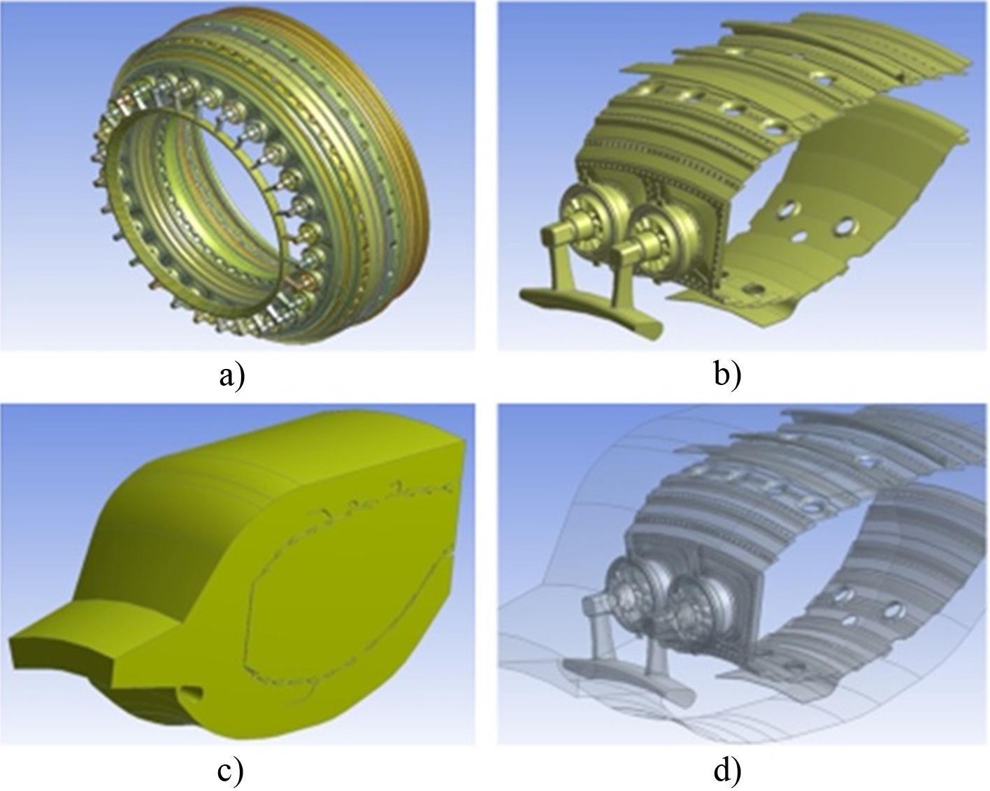 At the first stage (Fig. 2a), using the appropriate software, a computer 3D model of flame tube turbofan engine AL-31F was created, without improved cooling. Based on the original design documentation, this element was created in the form of an assembly of its individual constituent elements (wall parts, nozzles, swirlers, and other elements). This made it possible to represent, on a 1:1 scale, all the design features of flame tube, as well as to reliably determine the connections between the elements.