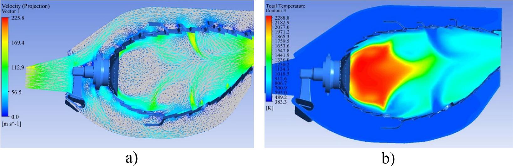 Distribution of velocity vectors and temperature field along the length of flame tube