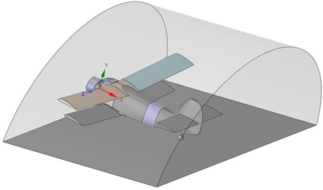 A “big” model encompassing a mesh for the external domain, shown in Fig. 3, including the geometry of the airplane with the running propeller, the frontal part of the engine bay, the fuselage with inlets and outlets to the equipment bay, the wings, and the tail surfaces. This mesh covered a semi-spherical domain within 50 meters from airplane, with the plane located at its centre. The purpose of this model was to determine the pressure and velocity field around the airplane, in order to use them as boundary conditions for smaller models.