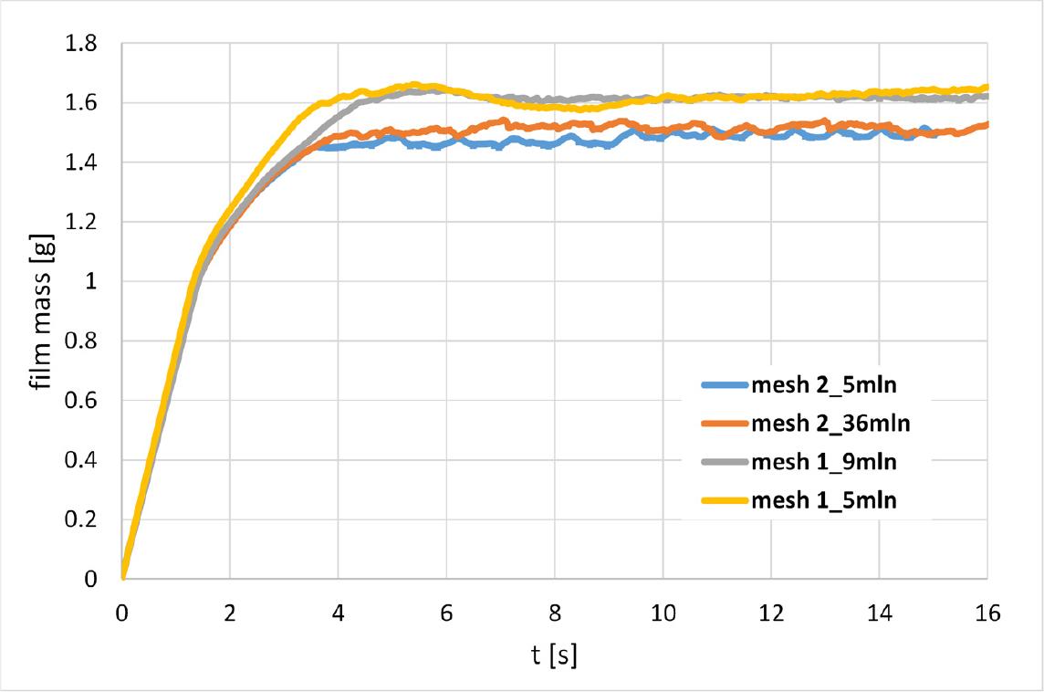 In order to simplify the modelling of the fuel film in this part of the study, the modelling of droplet flow was omitted. Instead, the fuel film originated from a predefined zone in the floor of the bay, shown in Fig. 7, where appropriate source terms for the fuel film were defined. The film was then driven by gravity and airflow towards the closest outlet. The film flux was set to 0.77g/s (approximately one-third of the value considered for the full bay), at which value the fuel film mass and its vaporization rate stabilized within several seconds. In Fig. 8 the change in time of film mass is shown for four mesh densities. Results indicate that while its mass stabilizes in time in each case, the stable values for denser meshes are lower than ones obtained for less dense meshes within the tested range. A possible explanation for this result is the increasing accuracy in determining the surface area covered by the film, achieved with smaller surface elements.