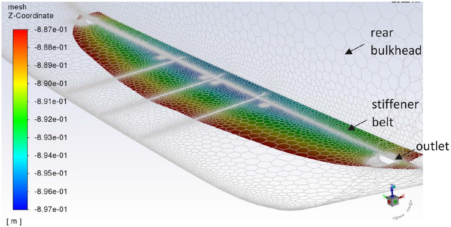 The pressure values presented in Table 1 were determined on an “intermediate” model as surface-averaged values on the respective inlet and outlet surfaces and applied as boundary conditions for simulations of fuel leak and phase change. The leak source was set at a point located under a connection of elements chosen in consultation with the designers. It was modelled as an injection point of a stream of discrete particles using the Discrete Particle Model of ANSYS-Fluent. The droplets had a pre-defined diameter of 1 mm, and were subject to 1g acceleration, influenced by the airflow in the bay.