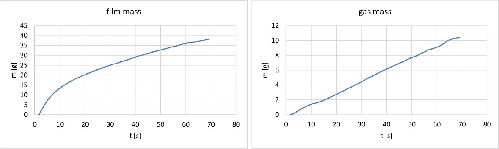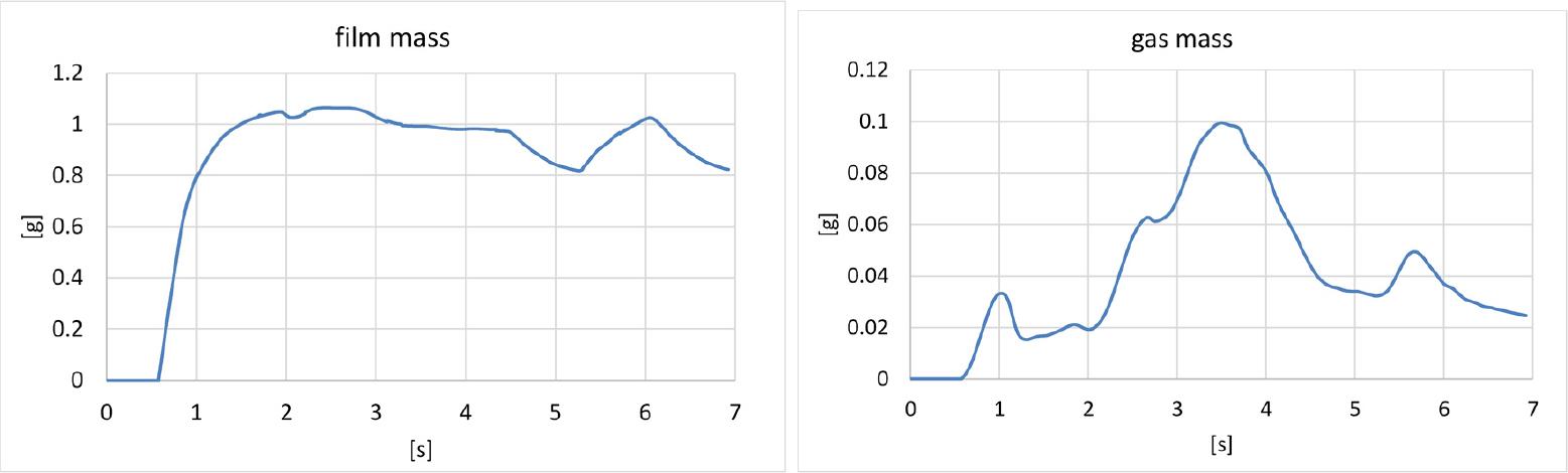 Time dependence of film mass flow and fuel vapor flow, summed over the outlets.