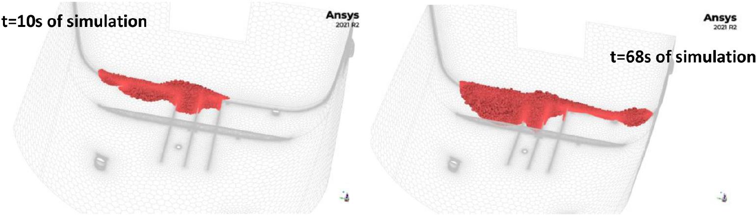 After quasi-steady airflow conditions were reached, the Discrete Particle Model was activated and droplets began to be injected into the domain. Upon reaching the floor surface, the droplets turned into an Eulerian Wall Film and moved along the floor of the bay. The transition of the droplets into the Eulerian Wall Film at 2s after the start of leak simulation is shown in Fig. 14. The fuel mass flow of the simulated leak was 2.6 g/s (approximately 2% of the electric pump’s capability).