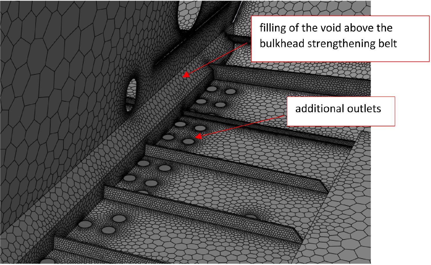 View of the additional outlets from the bay and of the filling above the strengthening belt, preventing the accumulation of liquid fuel