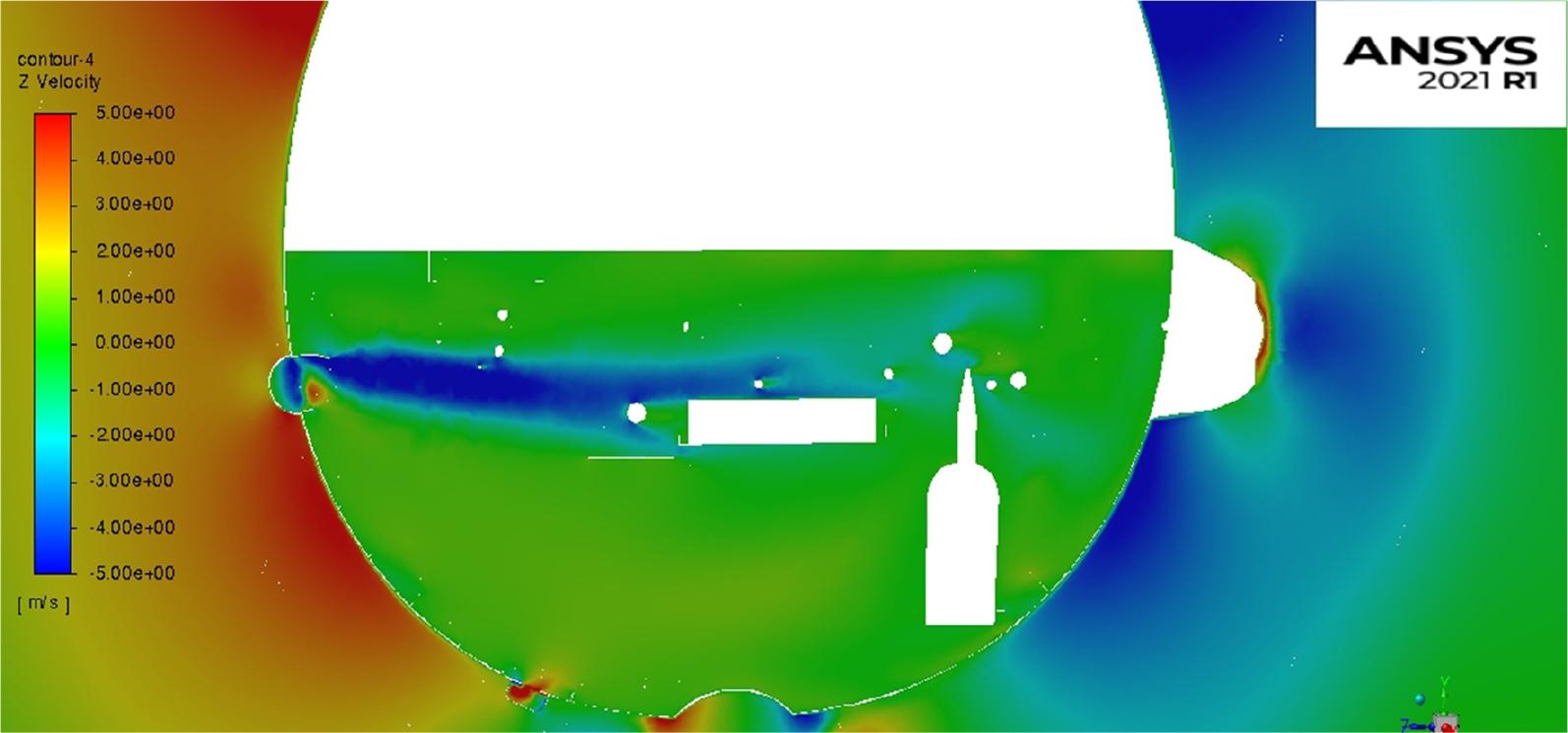 First, the results concerning the additional functionality of providing cooling, fresh air towards selected sub-systems are presented. These computations were performed on an “intermediate” model, with the computational domain both inside the bay and outside the airplane, as shown in Fig. 24. The velocity contours in cross-sections, where these elements are present, are shown in Fig. 25 and Fig. 26, as contours of the Z velocity (horizontal, negative for air moving to the right side). It can be seen that the additional inlets effectively fulfil their role. In Fig. 26, the existing, inefficient inlet is also visible, just below cabin floor.