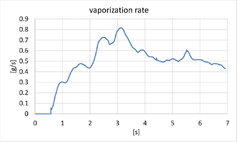 Figure 9 shows the change in vaporization rate for different mesh densities. As the mesh density increases, the maximum vaporization rate first increases, then decreases to a value close to that obtained for the smallest mesh. The changes are within approximately 22% of the maximum value, whereas the total mesh size changes by 40% of the maximum size. Figure 10 presents the mass of vapor collecting inside the bay as result of difference between the vaporization rate and outflow flux through the ventilation outlets. Except for the result for the roughest mesh, the maxima for the denser meshes are very close to each other and they occur at a similar time. For meshes bigger than 1.5 mln, after reaching maximum value the vapor mass stabilizes or tends to decrease.