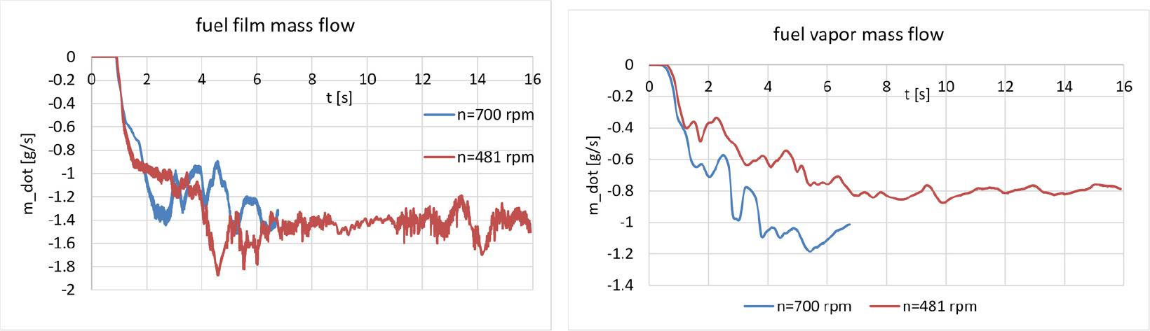 Time dependence of fluxes of liquid film and fuel vapor, integrated over the surface of all outlets.