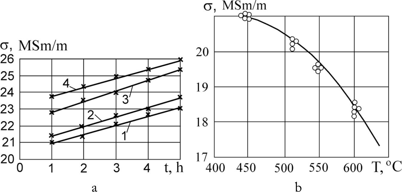 Heat treatment of AA components is performed to strengthen them and consists in fixing a supersaturated solid solution with subsequent aging. At the same time, the mechanical properties of AAs depend on the temperature regimes during the heating of products for hardening and aging, and the time of exposure of parts between heating and hardening when transferring parts to the hardening bath [2, 9, 10]. During heating for hardening, the dissolution of strengthening components in aluminum occurs, which leads to a corresponding decrease in the SEC. This decrease is explained by the distortion of the crystal lattice of aluminum and the increased scattering of conduction electrons. The higher the heating temperature, the greater the decrease in the SEC of the alloy, which is associated with an increase in the concentration of the solid solution and the number of vacancies.