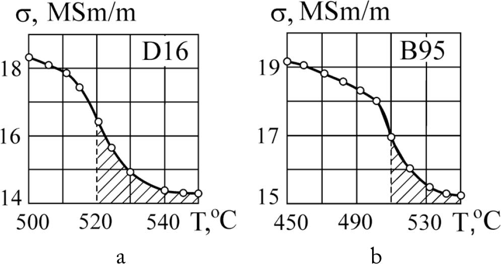 An increase in the heating temperature of components made of AAs during heat treatment can lead to overburning, which manifests as melting along grain boundaries. Such parts are rejected by the SEC measurements. Fig. 3 illustrates the dependences of the SEC of heat-strengthened AAs of D16 (a) and B95 (b) types on the temperature of heating during hardening [2].