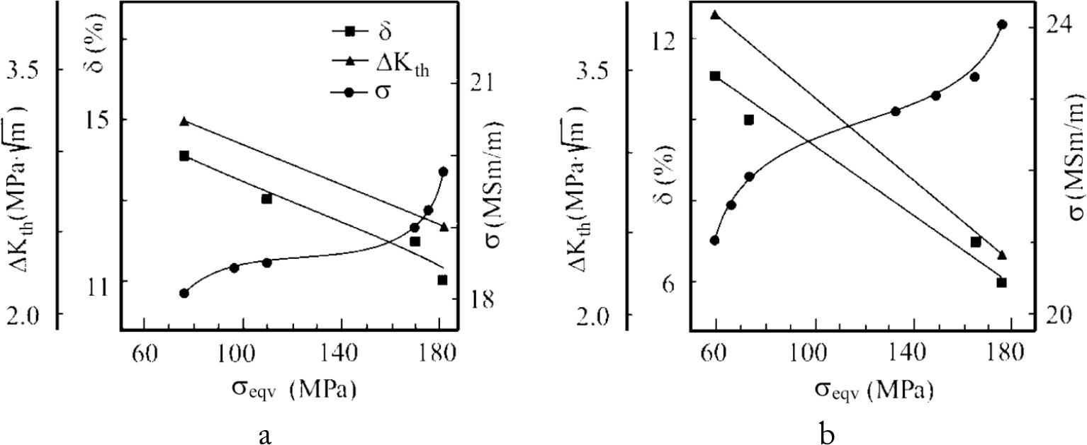 Dependencies between elongation δ (◼), fatigue threshold ΔKth (▲), level of operational equivalent stresses σeq (□) and SEC (σ) of degraded AAs of D16 (a) and B95 (b) type