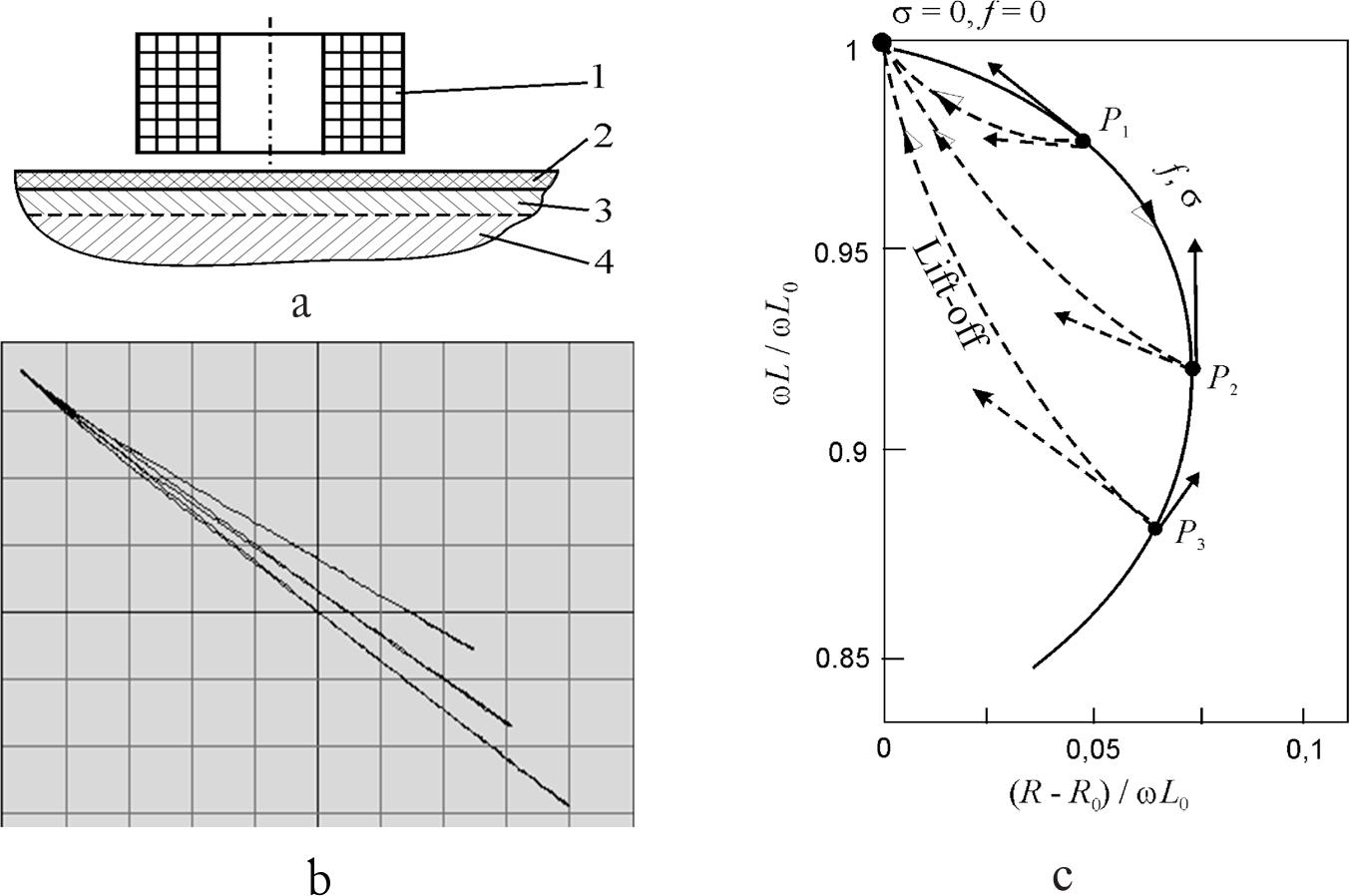 EC current probe situated above typical aircraft structure: 1 – EC coil, 2 – dielectric coating, 3 – pure aluminum plating, 4 – main aluminum alloy (a); experimental hodographs concerned with lift-off influence for AAs of different SEC σ (b), and the typical dependence of the EC probe impedance on the changes in the SEC σ, operational frequency f, and the lift-off (c).