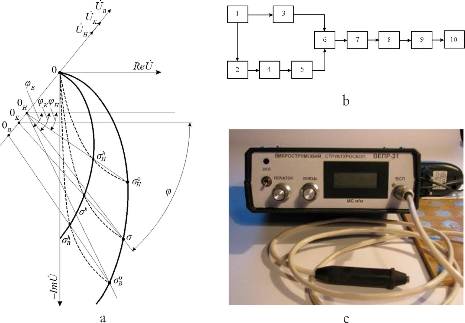 Eddy current phase algorithm for conductivity measurements with lift-off influence suppression (a); generalized scheme of the conductivity meter based on the phase measurements (b); and prototype of the developed EC conductivity meter of VEPR-31 type.