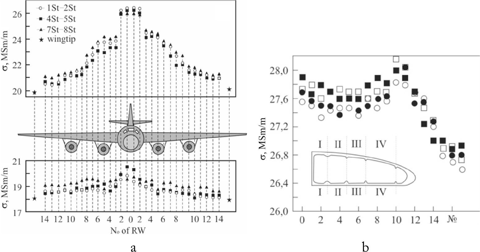 The developed technique was tested by measuring SEC distribution in different zones of the upper (B95 type AA) and lower (D16 type AA) wing skin of an AN-12 aircraft, which has been in operation since 1966 [10, 11]. Measurements were carried out using an EC conductivity meter of VEPR-31 type (Fig. 6c). The distribution of SEC σ of the AAs of the upper and lower wing skin of the AN-12 aircraft, in the area between the 4th and 5th stringers along the wing from the root of the wing to its end by the numbers of ribs, is shown in Fig. 8. The values of σ (▲) on the wing tips are also indicated.