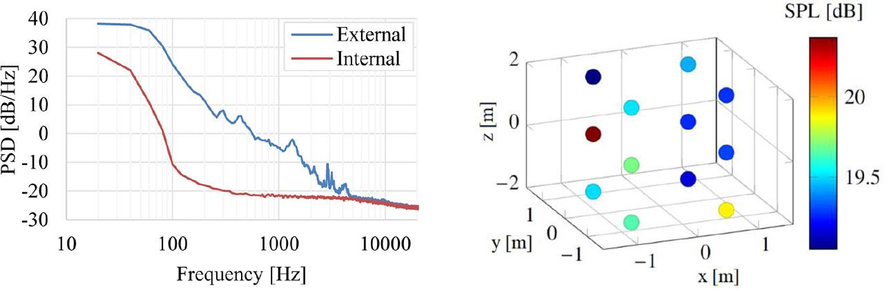 Background noise in the anechoic chamber: PSD of acoustic pressure at position [0.79, −0.85, 0] and outside of the chamber for reference (left), and SPL spatial distribution (right).