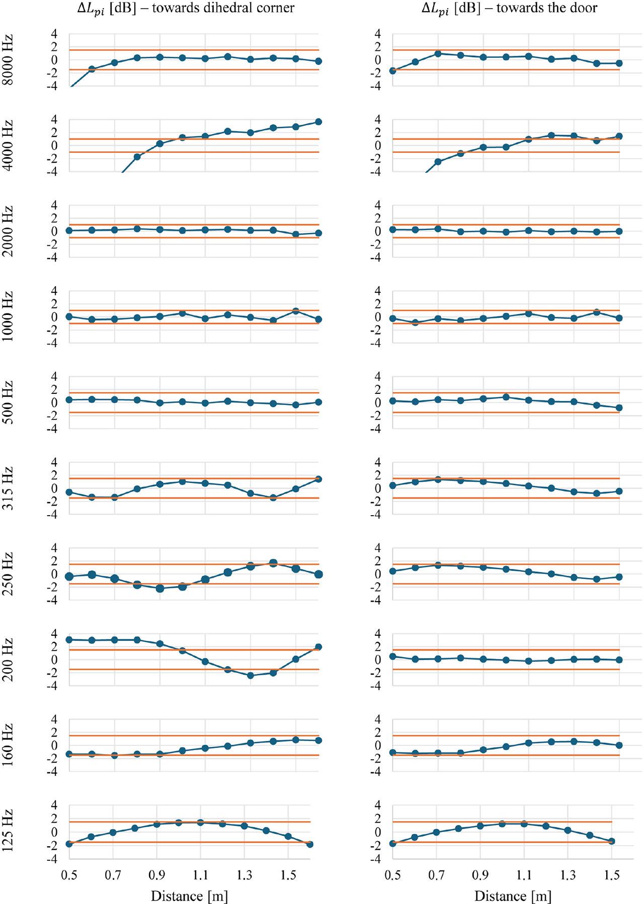 The ISO 3745 standard [34] defines the measurement procedures required to verify the anechoic condition, and specifies 5 directions away from the source that should be tested for complete verification of the whole chamber. Because of limitations of the test setup, only two horizontal directions have been tested so far: towards a dihedral corner (parallel to the z-plane, 43.6° off the x-axis) and towards the door (parallel to the z-plane, 11.2° off the y-axis). However, all measurements and data processing were carried out in accordance with the standard. For each direction, the microphones were placed at distances from 50 cm to 160 cm away from the geometric centre of the source, at a resolution of 10 cm. At each position, pure tones were generated at centre frequencies of one-third octaves between 50 Hz and 10 kHz, resulting in 24 frequencies. The sound pressure level generated by the source varied depending on the frequency, but exceeded the background noise level by at least 30 dB at all frequencies, and by at least 70 dB at frequencies of 100 Hz and above, for all microphone positions.