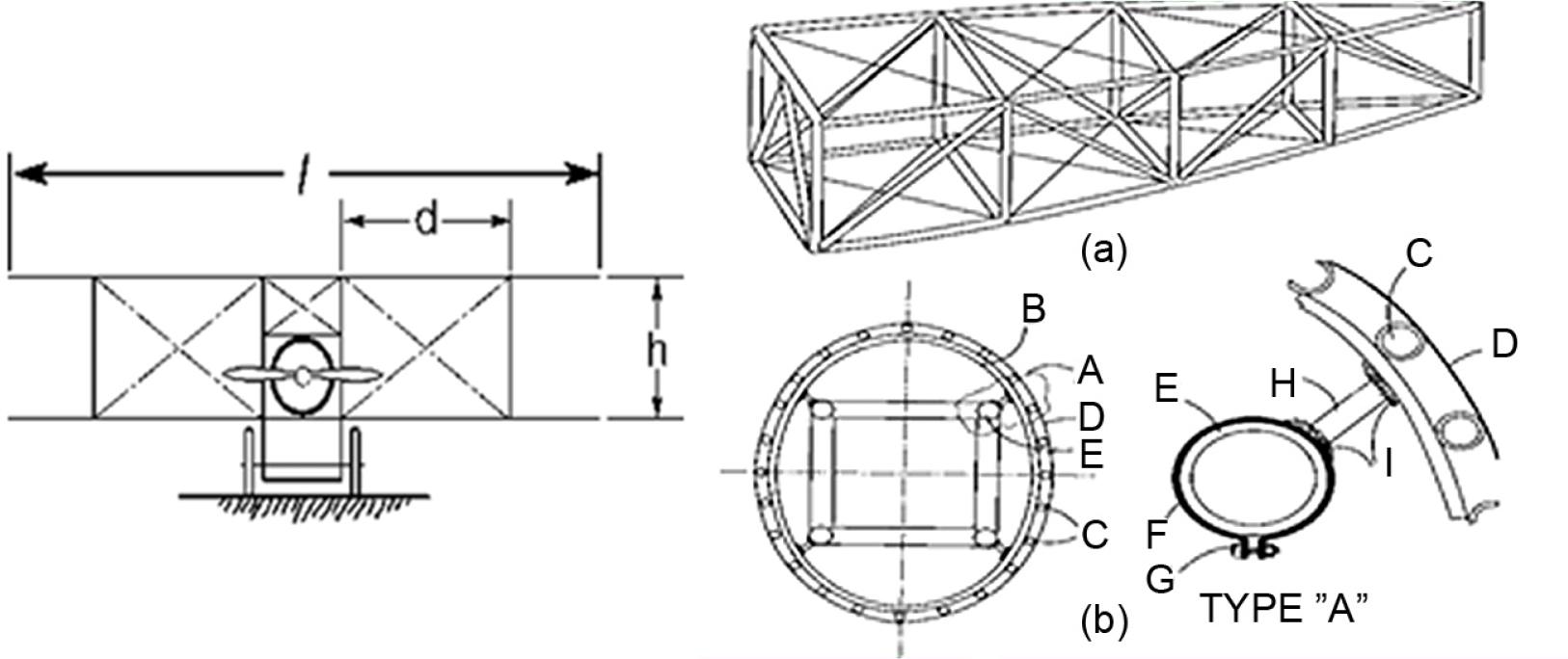 Typical biplane configuration and elements of a truss-type fuselage: (a) Structural framework; (b) cross-section of the rigid truss enclosed within the fairing. On the right: principal structural components – B, rigid truss; C, stringers; D, outer skin; E, tubular longerons; F, docking clamp; G, docking bolt; H, short tube; I, welded joints.
