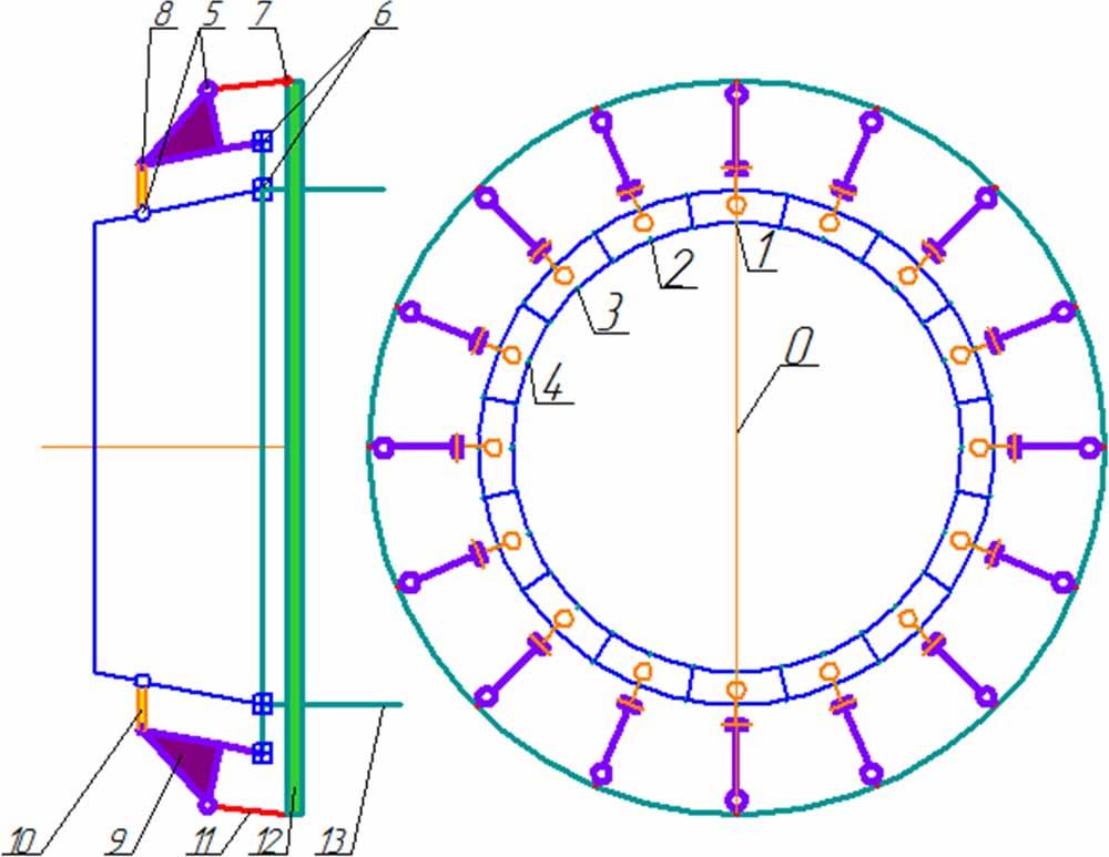 The kinematic scheme shown in Fig. 2 preserves the same principle of changing the throat area and allows the thrust vector to be deflected by turning the nozzle flaps. To ensure the thrust vector deflection, a control element is introduced – a ring (12), the position in space of which is uniquely determined by three hydraulic cylinders. The ring is connected to the triangle (9) through the lever (11), and they are connected to each other by means of a spherical hinge (5).