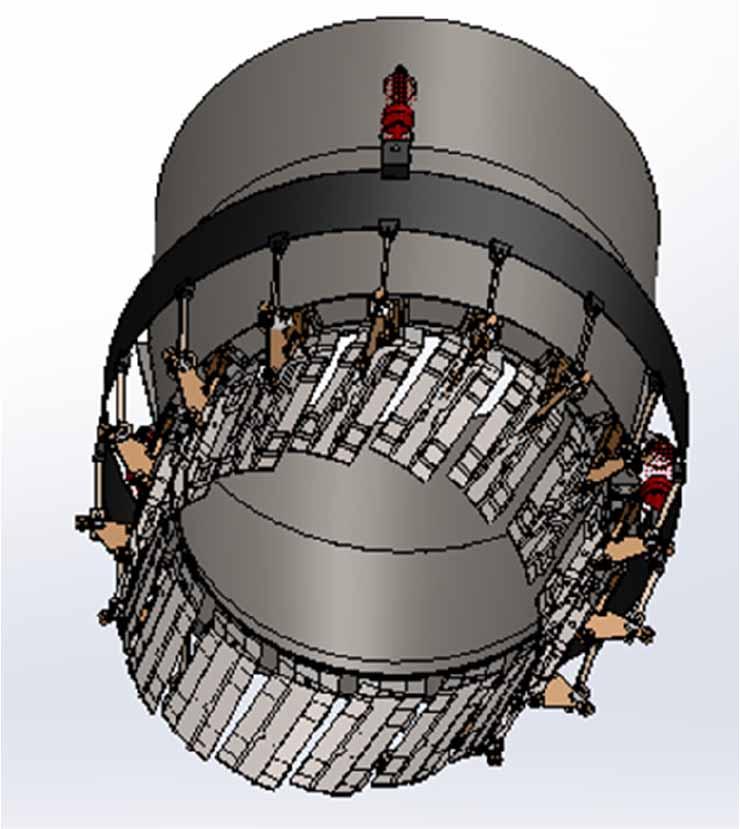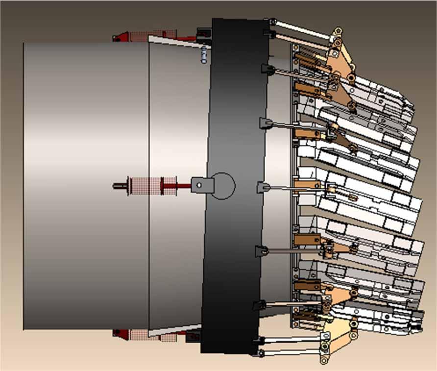 To achieve mechanical synchronization – beyond synchronization of the hydraulic system itself – a special bracket with levers is installed. This bracket is attached to the AB casing and links two adjacent flaps. If one cylinder fails, the affected flap, although deprived of direct actuation, is forced by the bracket to follow the motion of the neighboring flap, thereby preserving overall nozzle geometry to the extent possible.