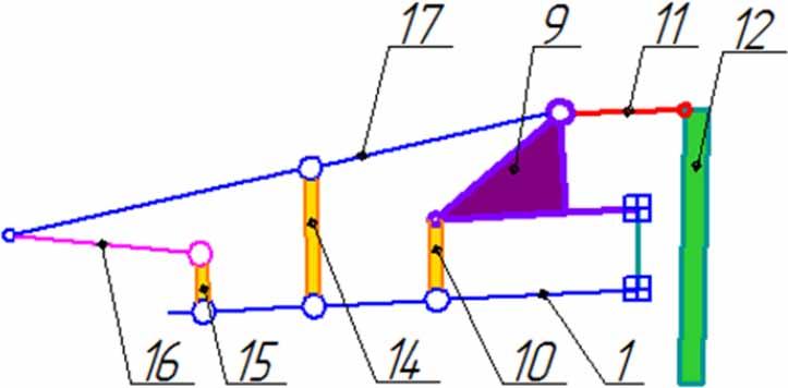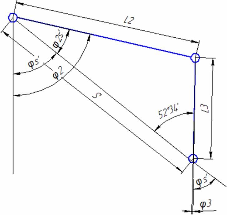 In this section, the task is to establish the dependence between the position of each mechanism element and the position of the initial link. The connecting triangle is chosen as this initial link, and its deflection angle from the starting position, ϕ′1, is taken as the reference parameter (Fig. 10).