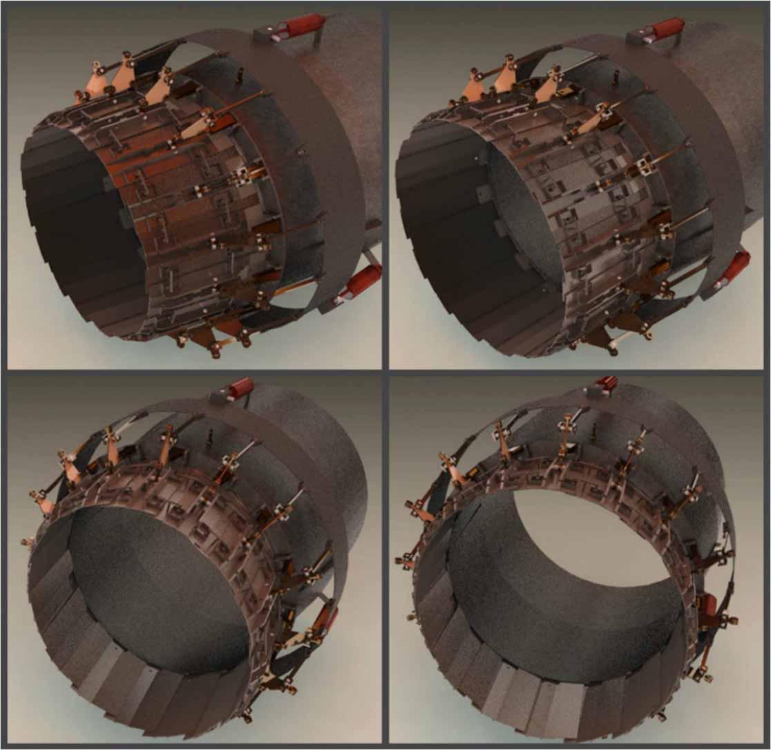 For the subsonic TVC nozzle, the optimal number of flaps was determined to be sixteen. A three-dimensional model incorporating sealing spacers is shown in Fig. 7, which also presents the assembly in four operating positions. In the upper-left view, the nozzle is deflected 8° to the left; in the upper-right view, the nozzle is deflected by the same angle, but the throat diameter is increased by a factor of 1.3. In the lower-left view, the thrust vector is deflected 15° to the right.