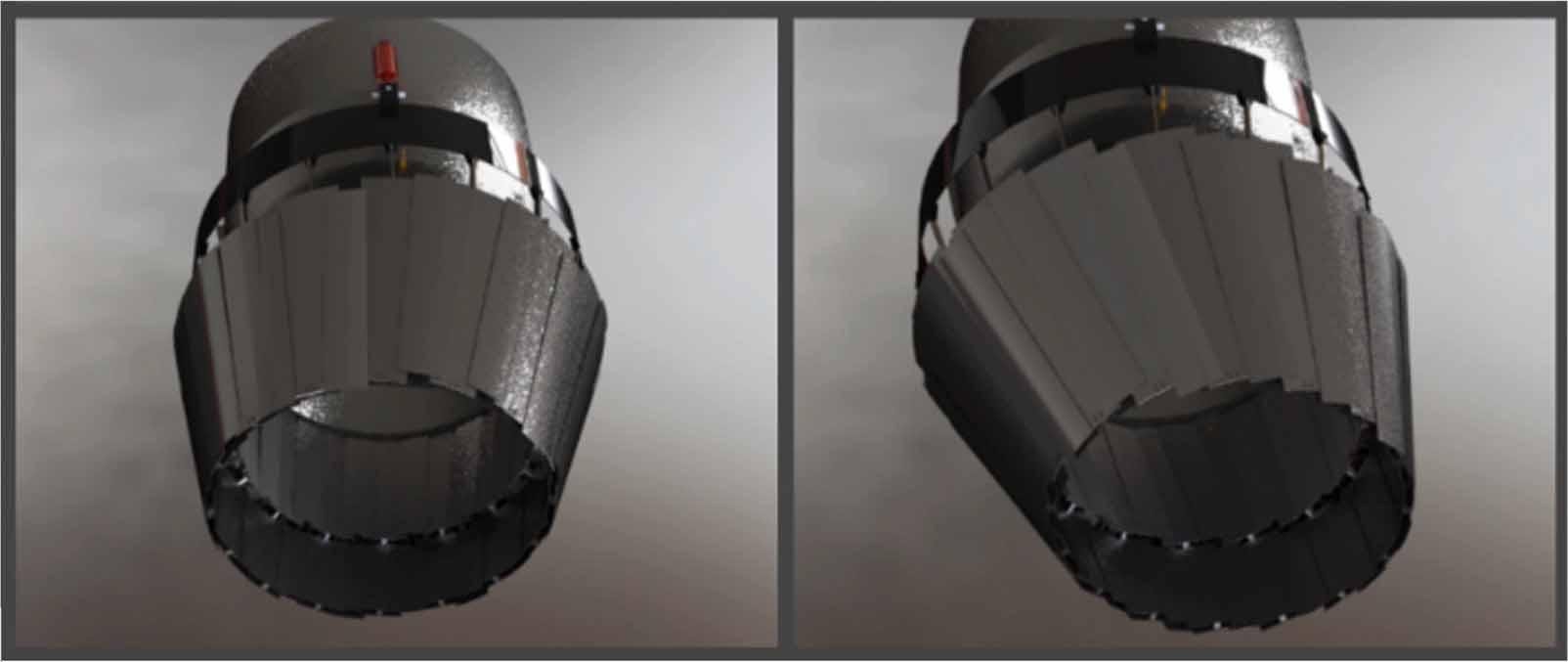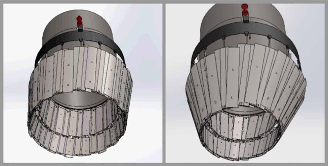 In the left image, the nozzle is deflected 8° to the left and has a throat-area diameter of 686 mm. In the right image, the nozzle is deflected by the same angle but with a reduced diameter of 516 mm. This corresponds to a total diameter-change factor of 1.33. According to the technical specifications, however, the diameter must change by a factor of 1.45. This required ratio can be achieved by increasing the panel dimensions.