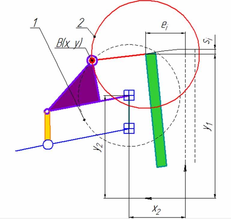 The numerical coordinates of point B can then be obtained by solving the system of equations (5.3), which consists of the equations of circles 1 and 2. Circle 2 is the trajectory described by lever 11, and circle 1 is the trajectory described by triangle 9. The initial coordinates of circle 1 are (x2, y2), of circle 2 – (ei, si + y1).