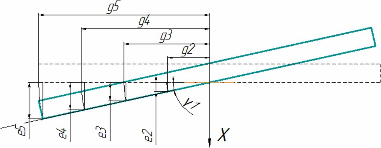 g2, g3, g4, g5 – distances from a point on the ring’s rotation axis to the location where lever 11 is attached; e2, e3, e4, e5 – x-coordinates of the attachment points of lever 11 to ring 12 in its deflected position.