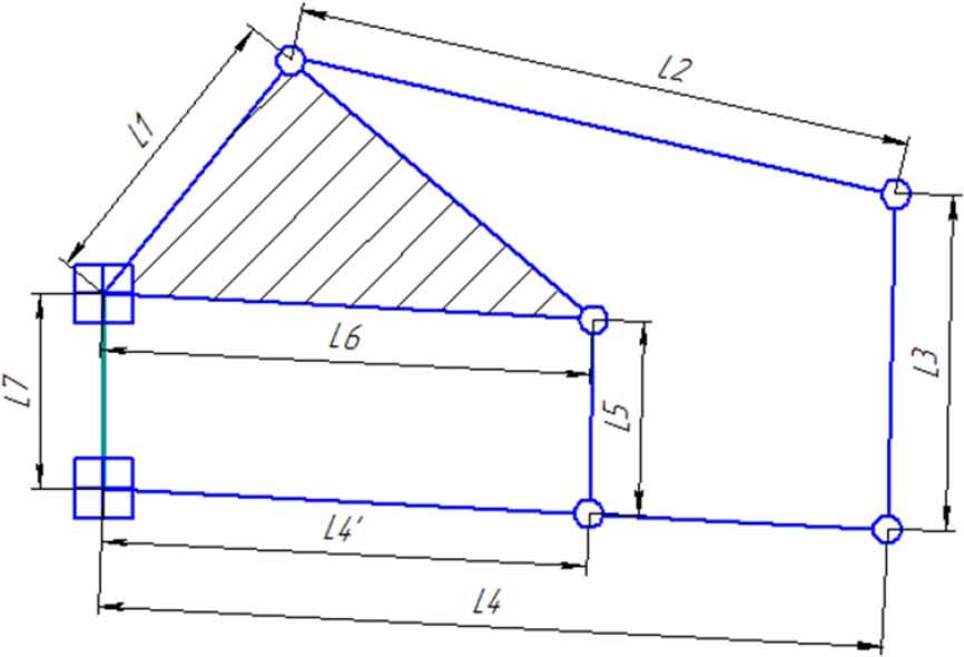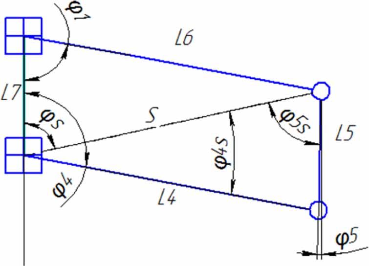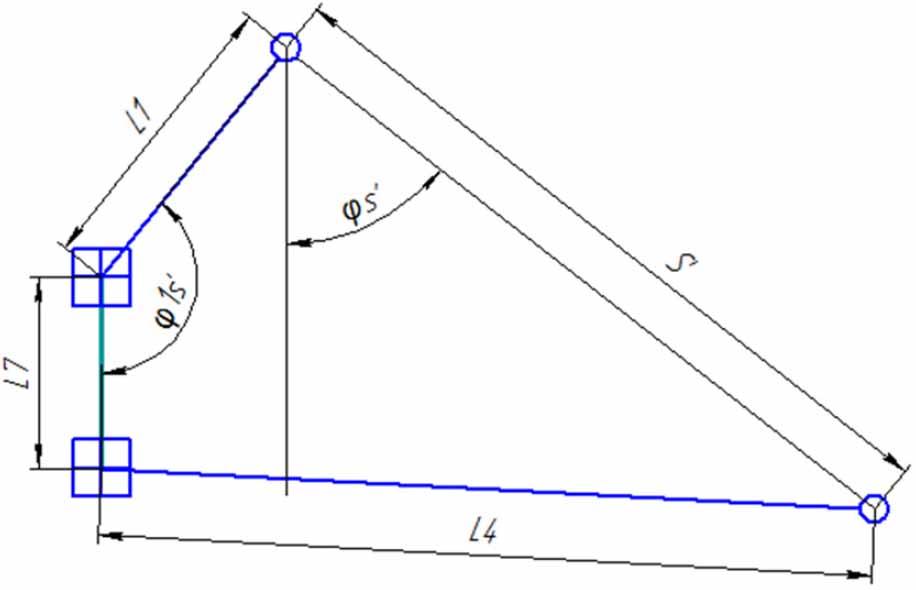Once φ′1 has been so determined, we can proceed to analyze the kinematic scheme in the plane parallel to the triangle profile. For this analysis, a planar representation of the problem is sufficient, so all spherical and universal hinges are replaced by pin joints. First, the scheme is represented as a system of interconnecting levers, with lengths shown in Fig. 13 and denoted as L1, L2, L3, L4, L4’, L5, L6, L7, where: