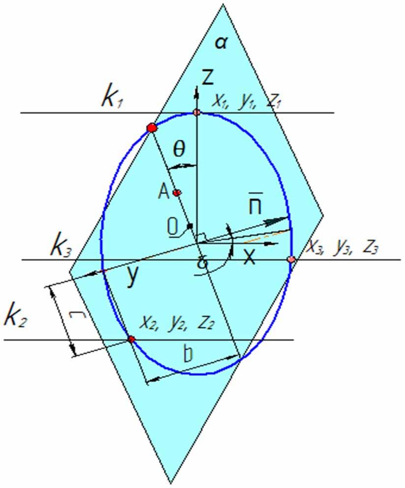 The ultimate goal is to determine the coordinates of the intersection points of the piston rods with the plane α, shown in Fig. 18. To this end, we represent each piston rod as a straight line ki and describe it with a system of equations that determines the position of the line in space as the intersection of two planes:
