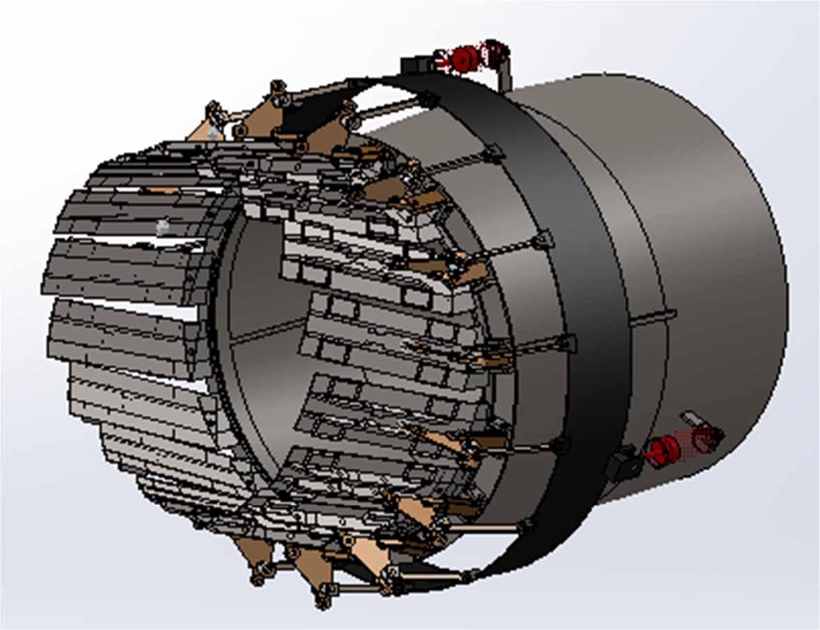 Both the cover flaps and the ejector flaps must deflect in all available planes at the same angles as the subsonic flaps, following their motion synchronously. The design concept is essentially a “layered” extension of the existing subsonic TVC nozzle, incorporating additional components based on established solutions [23, 24].