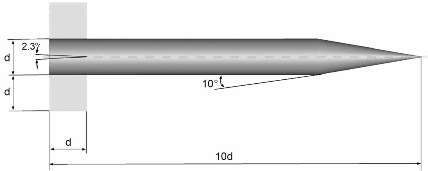 The geometry of the Finner model is shown in Fig. 2. It is a simple, easily reproducible cone–cylinder body with rectangular fins, making it suitable for scaling and systematic investigation. Detailed geometric parameters, including the fin radii, are provided in [13]. The center of gravity is located at 6.1d from the model nose. In the experimental studies reported in [6] and [14], the reference diameter was d = 30 mm. In missile aerodynamics, the diameter d serves as the characteristic length used in the definition of aerodynamic coefficients.