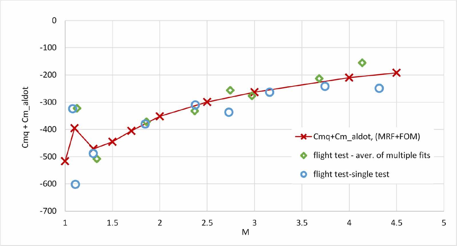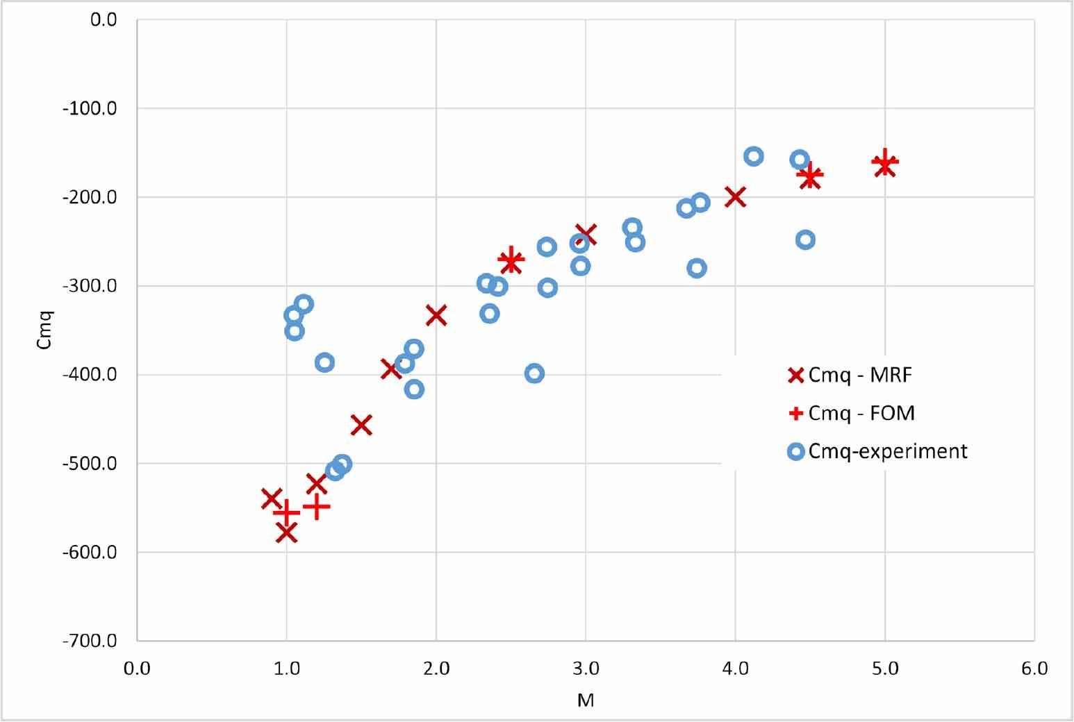 Figure 3 presents a comparison of the values of the (pitch-damping) derivatives cmq, computed in the presented work with the experimental values reported in [14] over a wide range of Mach numbers, from 1.0 to 4.5. The experimental methodology of [14] was based on identification of aerodynamic characteristics from free-flight trajectories on aeroballistics test range, where projectiles were launched using explosive charges.