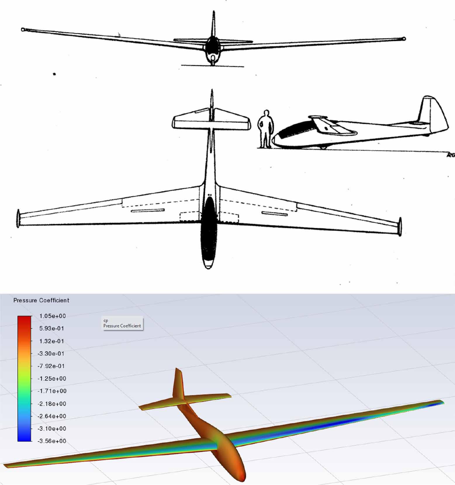 Geometry of the SZD-9 Bocian 1E glider in three views (from [16]) and surface distribution of pressure coefficient obtained for a steady flow at α = 10° and rotational velocity p = 0.5 rad/s, computed using the Moving Reference Frame in Ansys Fluent.