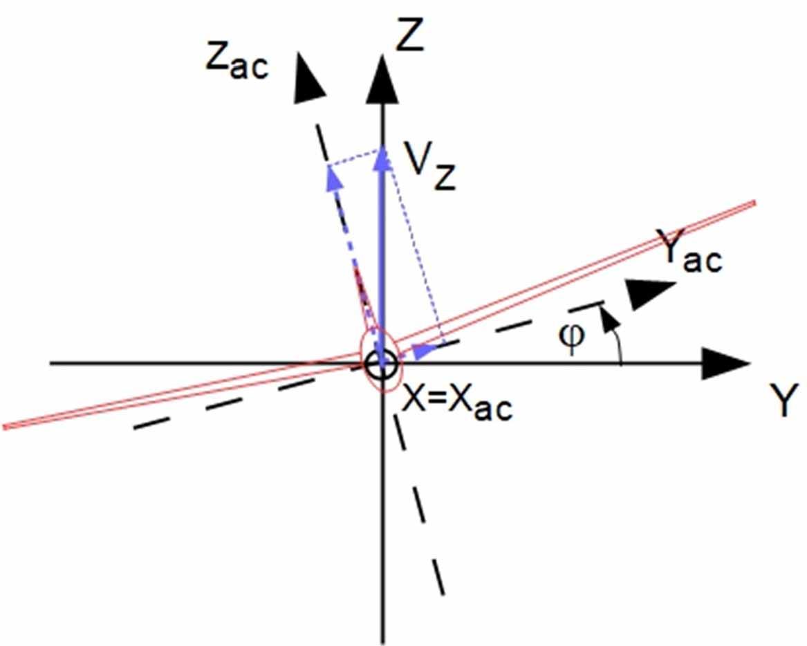 Appearance of a sideslip velocity in aircraft coordinate system Xac, Yac, Zac at non-zero angle of attack and non-zero roll angle φ. VZ is a free-stream velocity component along the Z axis. The axes of the coordinate system are the default axes of the flow solver.