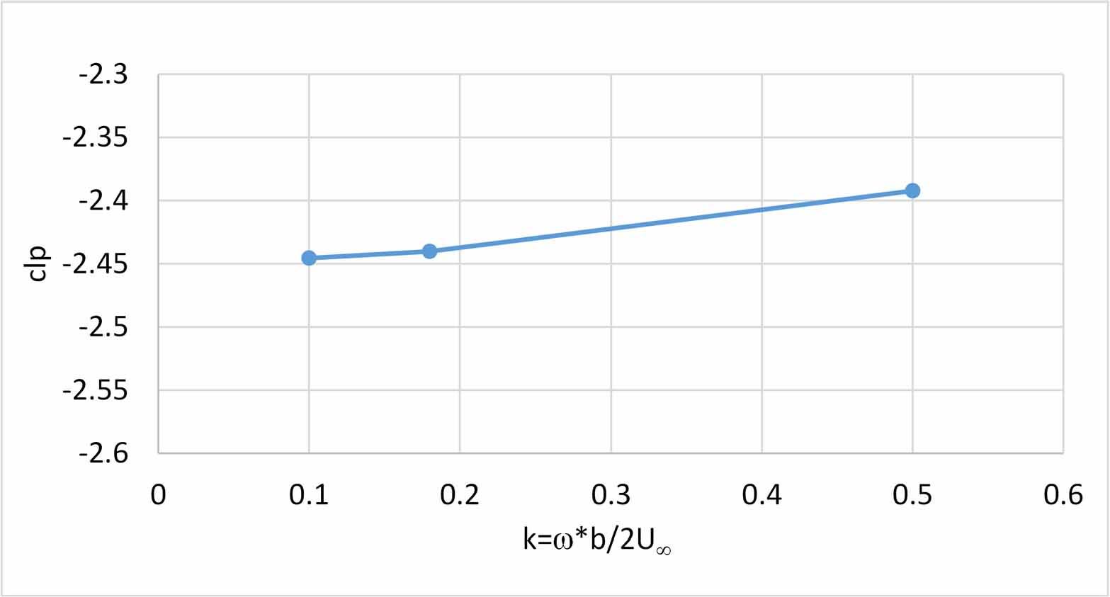 The first step was to investigate the influence of oscillation frequency on the computed value of clp. Simulations performed at an angle of attack of 4° showed that this influence is relatively small, as illustrated in Figure 11. In the range of reduced frequencies decreasing from 0.5 to 0.1 (corresponding to 0.6 to 0.12 Hz), the value of the derivative decreases from -2.445 to -2.392, a change of approximately 2.2%.