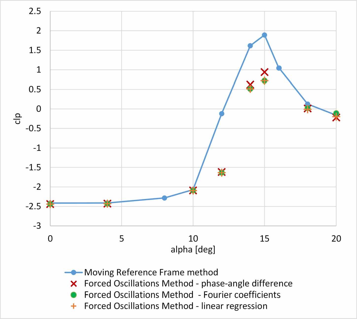 A comparison of the values of the clp derivative obtained based on cl values determined in the non-inertial reference frame (using the MRF method) with those computed in the inertial reference frame (using the oscillatory method) was performed for a range of angle-of-attack values of 0° – 20°. This range covers both attached-flow conditions and flow with increasing separation, eventually leading to the appearance of autorotation moment, which is an important phenomenon for flight dynamics and control. The results of the comparison are presented in Fig. 12. For low angles of attack, in the attached-flow regime, the results of the two computational methods and the results of the three result-processing techniques of the oscillatory method are identical. Differences between results of the two methods appear at angle-of-attack values where flow separation regions increase, and the results converge once again when the flow separation covers almost entire upper wing surface, as illustrated in Figure 16.
